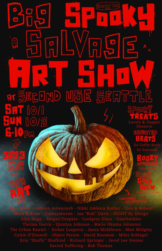 Join Second Use Seattle for it’s inaugural Big Spooky Salvage Art Show! This art show will be held and Second Use Seattle’s secret dungeon in SODO. Two evenings of spooky art viewing: October 1-2, 6-10PM both days. Costumes Encouraged! Haunted beats will be served by DJ Coffin Birth and DJ Starseed. Scary good brew will be served by Badger Coffee, along side spooky treats by Lovely & Dapper Desserts. Boozy offerings by and benefiting Hazelwood Preschool. Plus, late night salvage shopping at Second Use!
