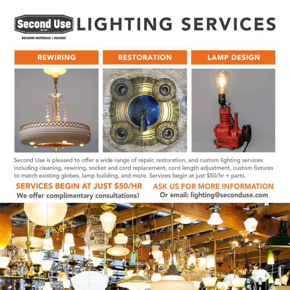 Have a light you love, but it needs repair? We have an in-house light shop and can help with that too! We are pleased to offer a wide range of repair, restoration and custom lighting services including cleaning, rewiring, socket and cord replacement, cord length adjustment, custom fixtures to match existing globes, lamp building and more! Services begin at $50 per hour and we offer complimentary consultations. Next time you are in, ask if a lighting specialists is available for a chat, or email [email protected] with pics and questions.