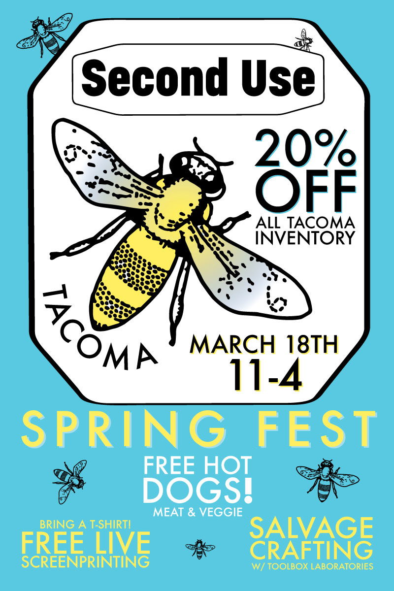 Join us in Tacoma on March 18th for the sale and festivities that is our Spring Fest! Not only is all Tacoma inventory 20% OFF, we’ll be serving up FREE hot dogs! Bring a tee-shirt and we’ll screenprint it into a bee-shirt*! (We’ll have a couple of popular Second Use tee designs that we can screenprint onto your tee or tote or wedding dress.) Stop by the booth hosted by Toolbox Laboratories and do some salvage crafting, or ask them for some tips and tricks about buying and using salvaged materials in your renovation projects!