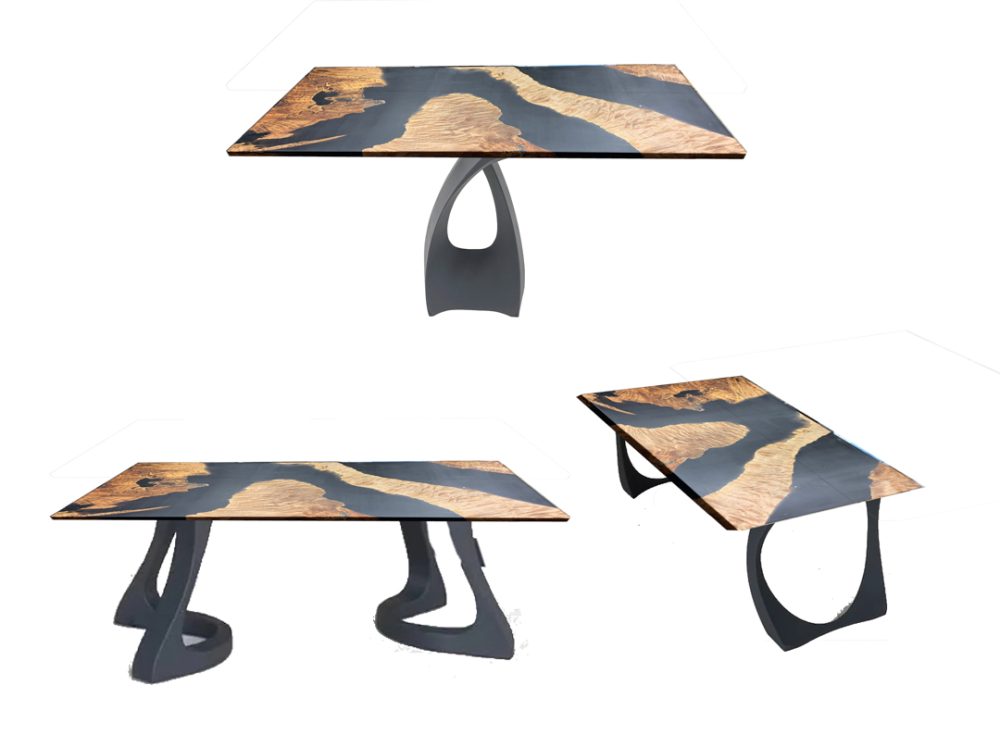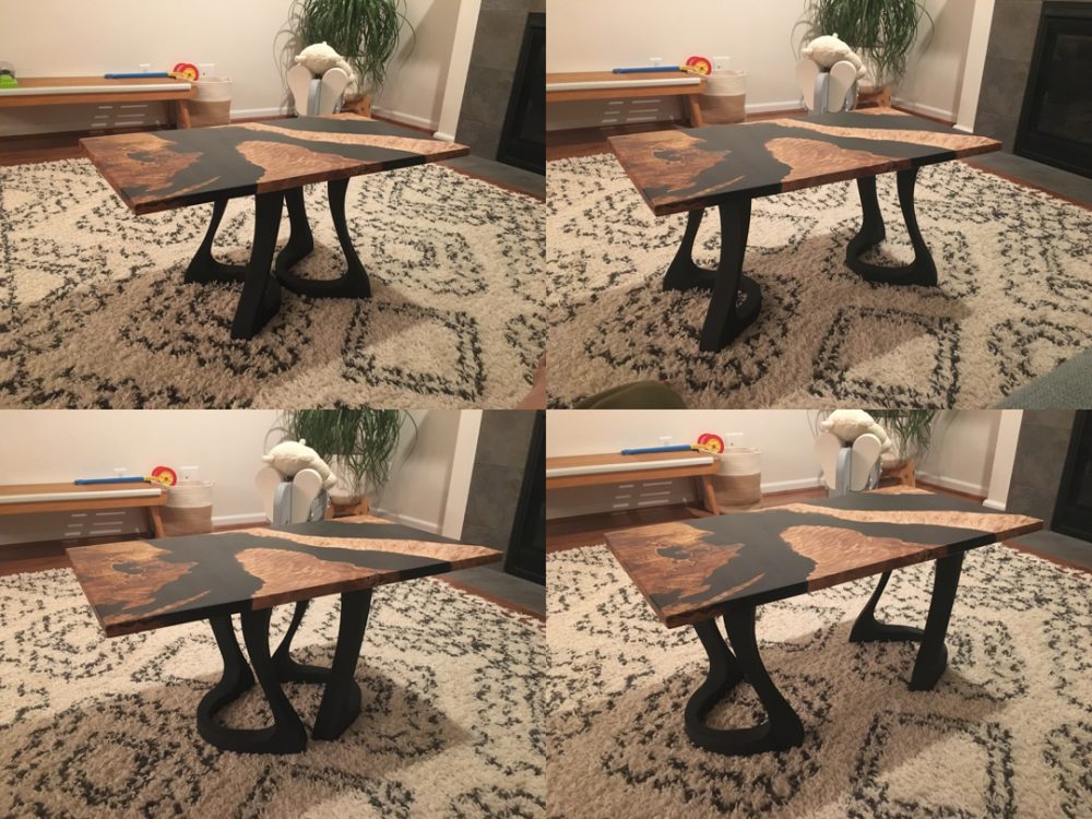 I got a blank stare when I said “I’m thinking of making these really cool legs” and pointed at my “Ultimate contemporary table legs” board on Pinterest. So, I got the message and started looking to purchase a pair of legs to put it on. Blacktail Studio’s Youtube channel came to the rescue when I saw him talking about Flowy Line Designs and how much he liked it. So, I found them on Etsy and looked through their options. We collectively agreed that if we could imagine those table legs with our live slab in our heads, we would be guests on Chip and Joanne’s show on HGTV. So, I called out to my inner Photoshop Gods to mask those table legs from Etsy to the actual slab to see how they’d roughly look. We went with the option on the bottom left that looked balanced to our eyes.