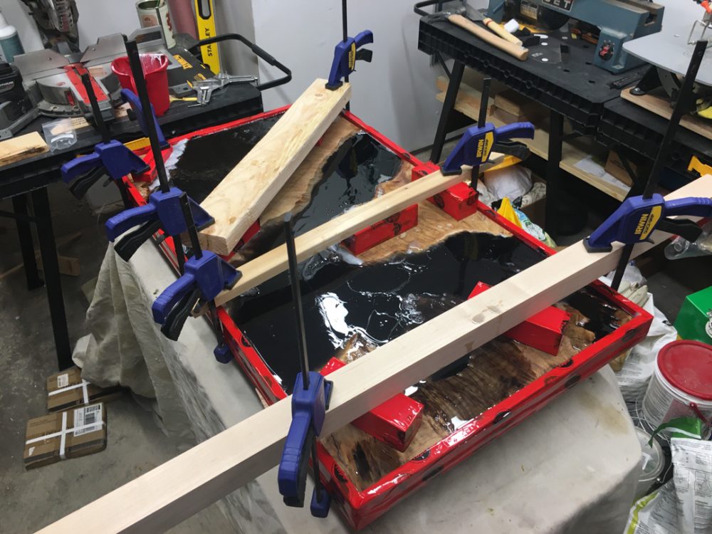 Next, I created a simple plywood tray to hold the pieces and epoxy together and wrapped everything with Tuck tape to ensure that the Epoxy doesn’t stick to the tray. I also wrapped a few scrap pieces of wood and clamped them to the tray to ensure that the pieces doesn’t float/move after the epoxy is poured.