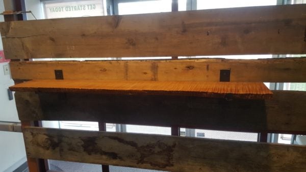 This tiger figured maple shelf practically glows! The reclaimed steel shelf supports add industrial charm to the naturally beautiful wood, finished with sunflower oil.