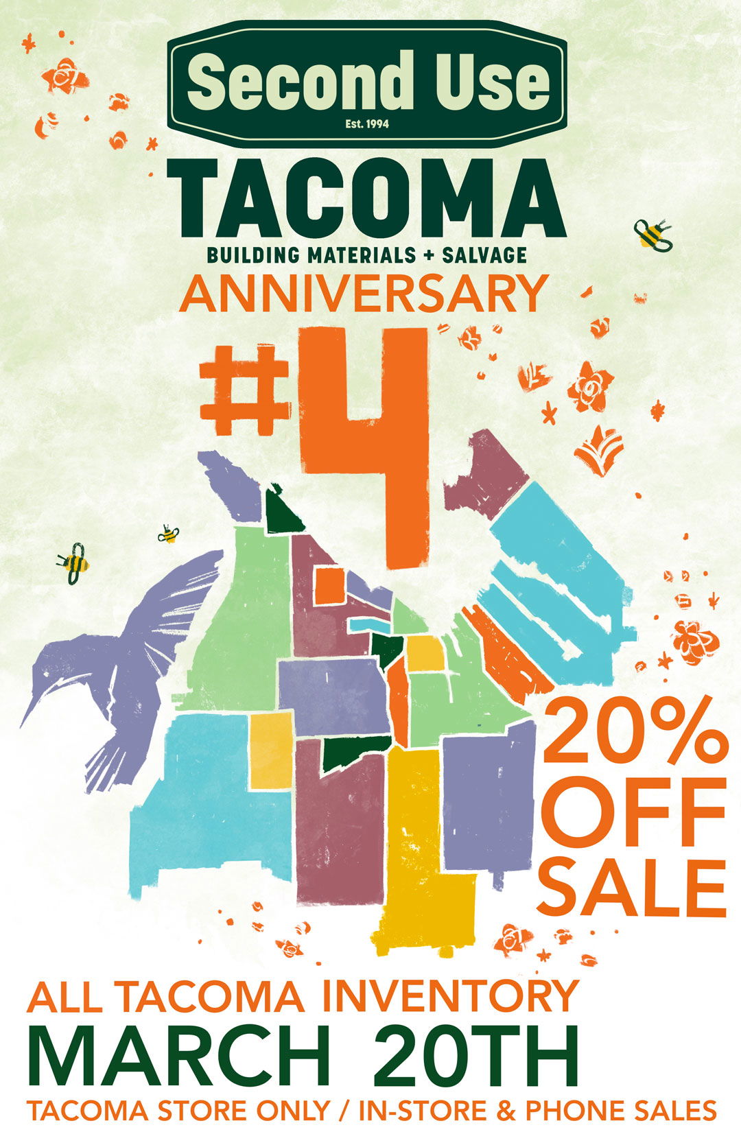 Our Tacoma store has been open for 4 years this March! We are celebrating with a 20% off all Tacoma inventory sale on Saturday, March 20th. Due to the fact that we are still in a pandemic and the State continues with its guidance for retailers, we will continue to maintain our capacity limits (as well as mask wearing and physical distancing practices).