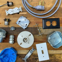 Electrical supplies like outlets, switches, conduit parts, boxes, brackets, cords, etc.